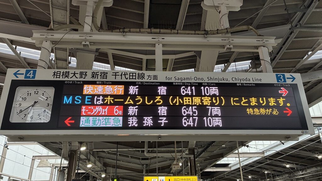 さて,前泊日の翌日からは,3日間にわたって出先へと赴いた。ホテルの場所の都合で,毎朝,短い区間だけ小田急に乗って通勤することになった。いずれの日も朝の6時台にホテルを出発して,小田急の電車に乗った。この時間帯の小田急は,上述の快速急行だけでなく,マニアの心をくすぐる電車を走らせている。冒頭の案内表示の写真がそれで,着目したいのは6:47発の「通勤準急」我孫子ゆきだ。