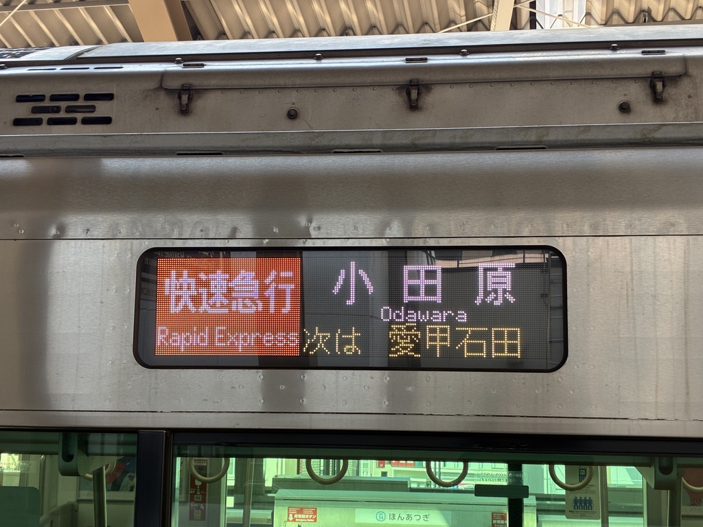 初日の前に前泊日があったので,この日に休みをもらって,ちょっと早めに目的地まで行ってみた。乗車したのは,「快速急行」小田原ゆき。快速急行という種別は,いかにも速そうでよい。実際小田急では,「快速急行」が,特急を除いて最速達の種別である。